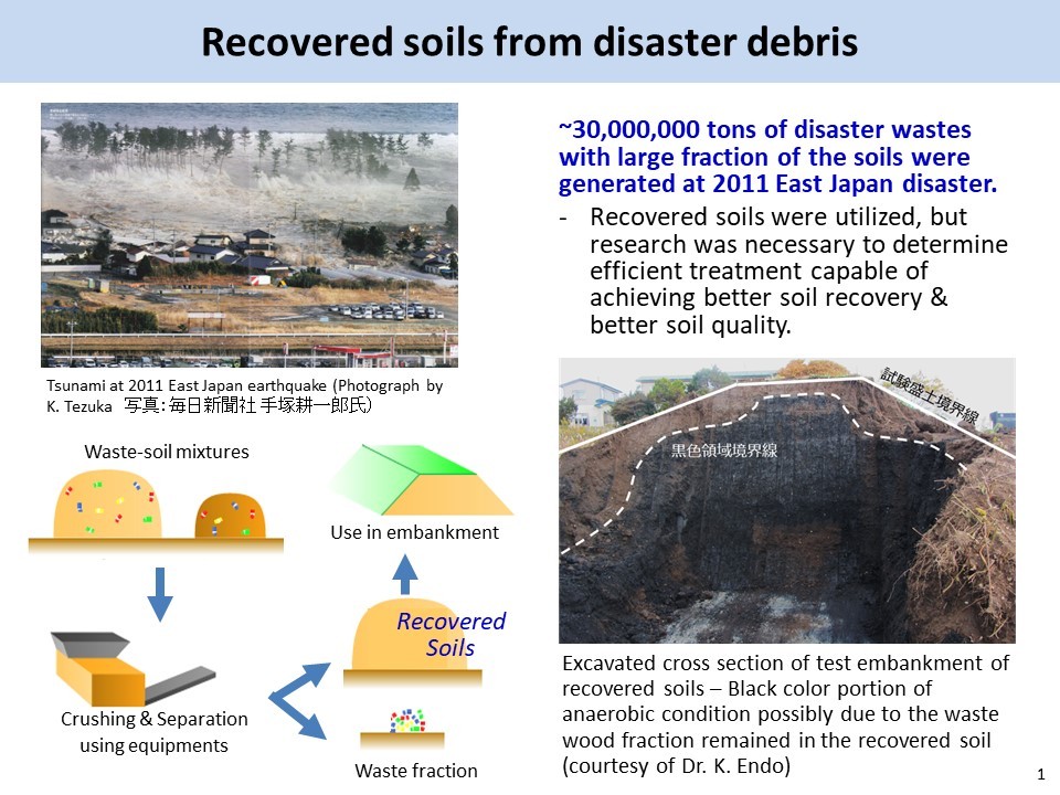(4) Brief Teaching Note: The contents of this slide aim to provide the information regarding the contribution of environmental geotechnics to disaster recovery. The 2011 Tohoku earthquake and tsunami generated ~30 million tons of disaster debris, requiring immediate and proper treatment under severe constraints such as limited landfill capacity. Soils were recovered by means of separation treatment of soil-waste mixtures of disaster debris. Research was necessary to determine efficient treatment capable of achieving both effective soil recovery and better soil quality. Pilot-scale test embankments were constructed to investigate the behavior of the embankments created with the recovered soils in which a small fraction of remaining waste might exist, yet no adverse effects were observed in terms of engineering properties and environmental suitability. Such efforts of geotechnical and geoenvironmental engineers contributed to the strategic utilization of recovered soils and the fast and smooth disaster recovery.