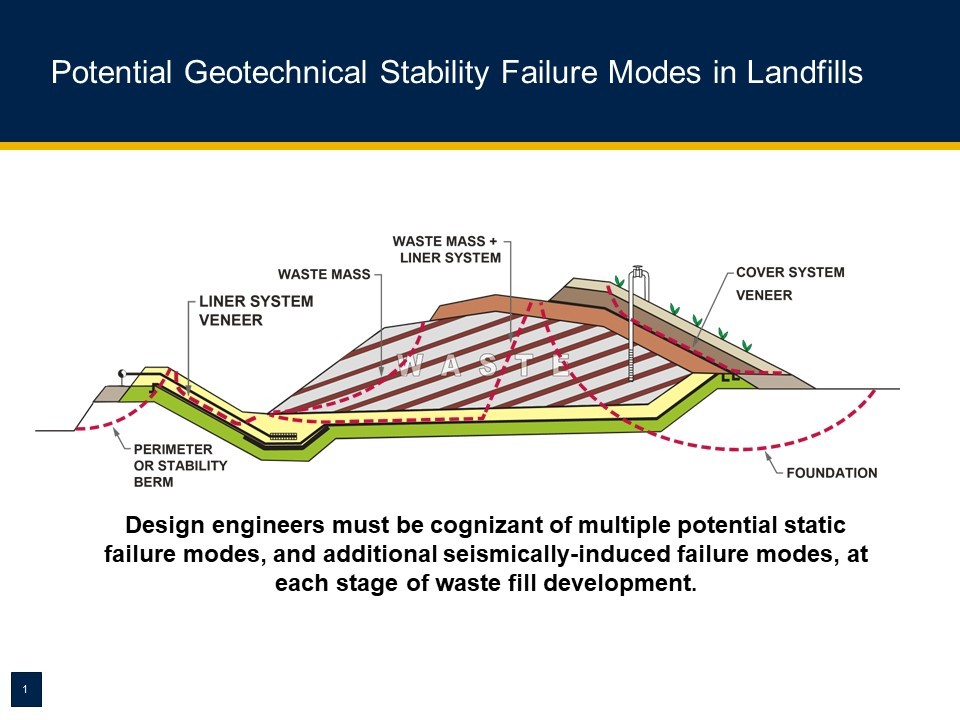 (3) Descriptive Title of Sample: A slide showing the different modes of slope stability failure at a landfill along with a narrative cautioning design engineers of the importance of evaluating these potential failure modes. The narrative also cautions that stability needs to be checked at every stage of landfill development, not just the final stage and that in seismic impact zones, seismic stability also needs to be checked.
