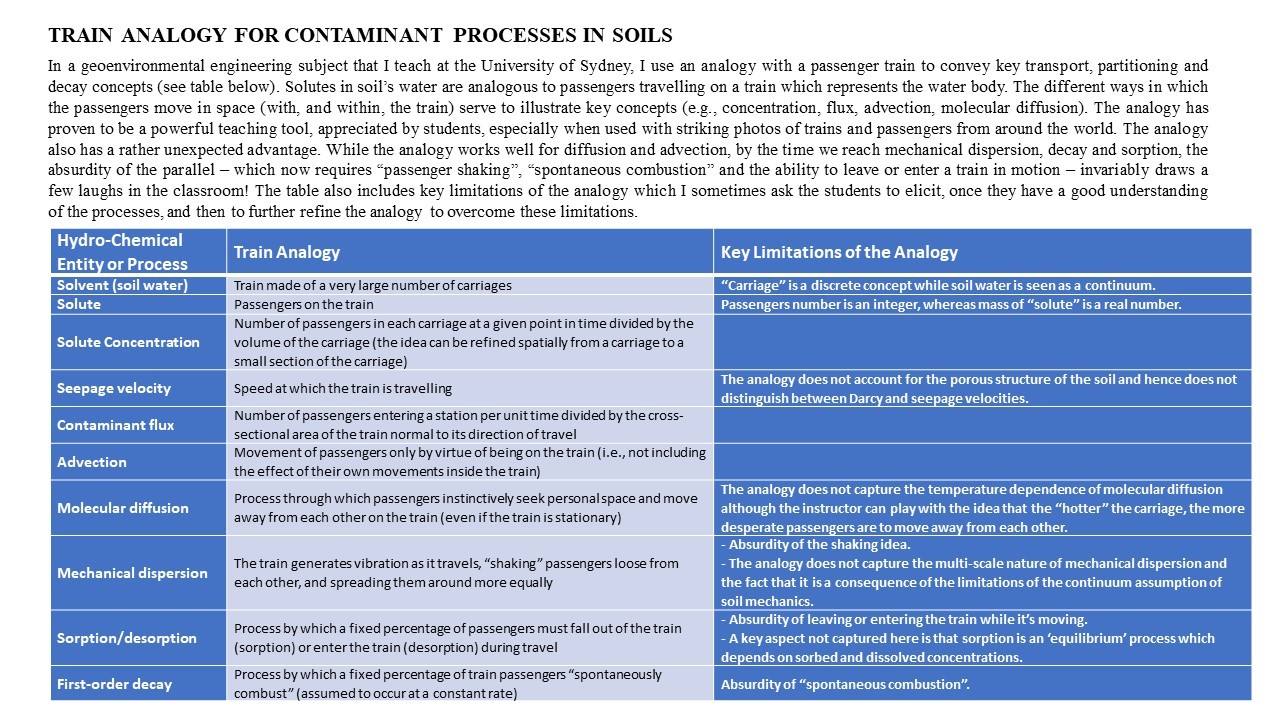 (4) Brief Teaching Note: Analogy with trains as a tool for teaching concepts and processes associated with contaminant transport in soil (concentration, flux, molecular diffusion, advection, mechanical dispersion, sorption, decay).